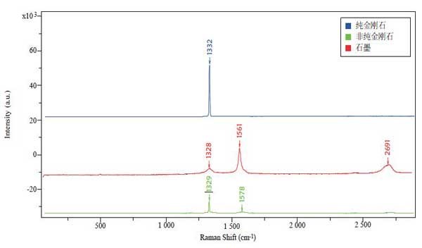 通過(guò)位于1332cm-1 拉曼特征峰判斷本次實(shí)驗(yàn)的三個(gè)樣品分別為純金剛石、石墨以及石墨及金剛石的過(guò)渡體,確定了鉆石的真假。