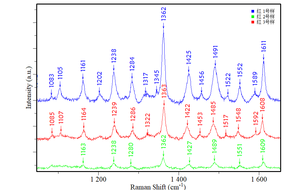 不同品牌、不同型號的紅色中性筆拉曼光譜圖如圖2所示。從圖中可以發(fā)現(xiàn),紅色中性筆的拉曼特征峰基本相同,說明3組物質(zhì)的組成物質(zhì)基本相似,但是,紅色1、2號樣品相較于3號樣品。拉曼特征峰較為明顯,說明,1、2號樣所含的油墨成分較多。同時紅色3號樣品位于1100 cm-1附近的兩個特征峰缺失,其產(chǎn)生的原因仍值得繼續(xù)深入研究。