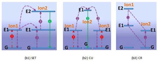 能量傳遞是指通過非輻射過程將兩個能量相近的激發(fā)態(tài)離子通過非輻射耦合,其中一個把能量轉(zhuǎn)移給另一個回到低能態(tài),另一個離子接受能量而躍遷到更高的能態(tài)。能量傳遞上轉(zhuǎn)換可以發(fā)生在同種離子之間,也可以發(fā)生在不同的離子之間。能量傳遞包含了連續(xù)能量傳遞(Successive Energy Transfer,SET)、合作上轉(zhuǎn)換(Cooperative Upconversion,CU)和交叉弛豫(Cross Relaxation,CR)三類。1