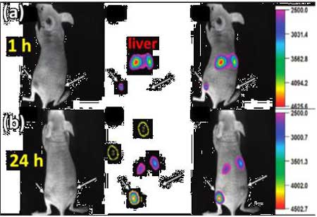 上轉(zhuǎn)換發(fā)光納米材料(UCNPs)具有熒光壽命長、潛在生物毒性低、穿透深度大、對生物組織損傷小且?guī)缀鯖]有背景光等顯著優(yōu)點,近年來在生物成像及生物檢測等領(lǐng)域已經(jīng)得到廣泛應(yīng)用,下圖未上轉(zhuǎn)換納米顆粒在生物活體中進行腫瘤標(biāo)記。