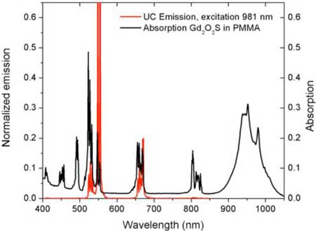 Figure 9.上轉(zhuǎn)換層在PMMA中的上轉(zhuǎn)換發(fā)射譜以及吸收光譜3