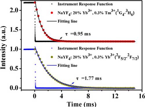Figure 11. 熒光衰減曲線:NaYF4:20%Yb3+,0.3%Tm3+材料Tm3+的1G4→3H6轉(zhuǎn)移(470 nm)和Yb3+的2F5/2→2F7/2轉(zhuǎn)移(980nm)