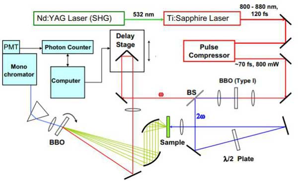下方為飛秒熒光上轉(zhuǎn)換裝置原理圖:飛秒激光其的激光脈沖經(jīng)過分束片分成兩束,一束激光脈沖用來激發(fā)樣品發(fā)射熒光,并把熒光收集后匯聚到BBO(偏硼酸鋇)晶體上,另一束光作為快門,門控光脈沖經(jīng)過光學(xué)延遲線,也匯聚到BBO上。然后記錄樣品受激發(fā)之后不同時刻熒光強度信息。