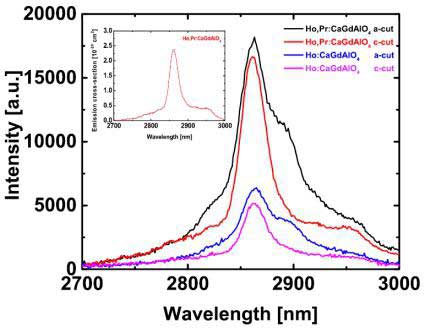 Ho:CaGdAlO4和Ho,Pr:CaGdAlO4晶體在1550nm激發(fā)下的中紅外發(fā)射光譜