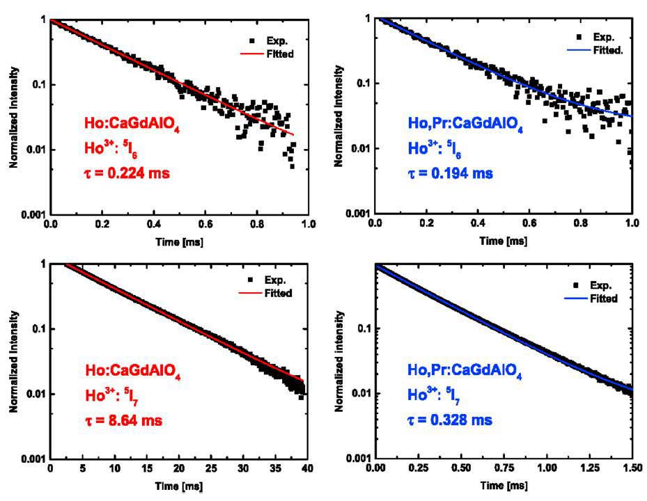Ho:CaGdAlO4和Ho,Pr:CaGdAlO4晶體熒光衰減曲線