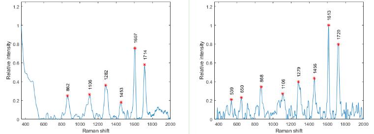 手持式拉曼實驗條件:1064nm激光器,激光功率300mW-350mW,光譜范圍200cm-1-2500cm-1,采集時間5s。