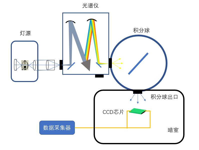 圖1:CCD芯片非均勻性測(cè)量流程圖,內(nèi)含TLS(可調(diào)光源)和積分球