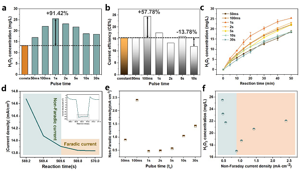 在脈沖電催化體系中,額外的trest可以為O2、H+和H2O2的擴(kuò)散提供足夠的時(shí)間,在催化劑表面形成高O2濃度同時(shí)低H2O2濃度的場(chǎng)景,這種電極-電解液界面上的介電弛豫可以減少電解質(zhì)中質(zhì)量輸運(yùn)造成的損耗;此外在EDL的充電過(guò)程中,電子在電催化劑中會(huì)發(fā)生快速而大量的積累,從而顯著改變催化劑的活化能;在EDL放電過(guò)程中,雙電層電場(chǎng)強(qiáng)度的改變也會(huì)導(dǎo)致催化劑表面對(duì)一系列中間體的吸附能力發(fā)生變化。這種由電位瞬態(tài)變化而引發(fā)的非法拉第過(guò)程,包括電容性行為、電子聚集行為和EDL電場(chǎng)強(qiáng)度變化,能夠?qū)﹄姶呋瘎┑慕Y(jié)構(gòu)進(jìn)行動(dòng)態(tài)調(diào)控,都能夠進(jìn)一步影響ORR產(chǎn)物/反應(yīng)物在對(duì)流區(qū)的擴(kuò)散,更新擴(kuò)散層及雙電層中的離子濃度和物質(zhì)分布。