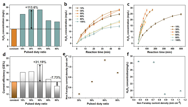 本文提出利用脈沖電催化來(lái)實(shí)現(xiàn)2eORR產(chǎn)H2O2中反應(yīng)物吸附、電化學(xué)反應(yīng)和產(chǎn)物擴(kuò)散的協(xié)同和多尺度調(diào)控。通過(guò)施加脈沖寬度為1s、占空比為30%、脈沖電壓為-1.0 V v.s. Ag/AgCl的脈沖電位,成功地將H2O2的產(chǎn)量提高了138.12%。此外證實(shí)了脈沖電催化中非法拉第電流密度與H2O2產(chǎn)量之間存在典型的“倒三角”關(guān)系,整體以1.0 mA·cm-2為分界點(diǎn)。DFT計(jì)算結(jié)果則表明,雙電層的放電過(guò)程能有效促進(jìn)O2在催化劑表面的吸附并適度調(diào)節(jié)*OOH的吸附能。*后從物質(zhì)擴(kuò)散、EDL充電過(guò)程中的電子積聚過(guò)程,及EDL放電過(guò)程中ORR中間體的吸附三方面提出了脈沖電催化促進(jìn)2eORR產(chǎn)H2O2的機(jī)制。該研究為脈沖電位電催化促進(jìn)H2O2生成的2eORR機(jī)理提供了新的見(jiàn)解,從而為今后電化學(xué)反應(yīng)的精確控制和高效傳導(dǎo)提供指導(dǎo)。