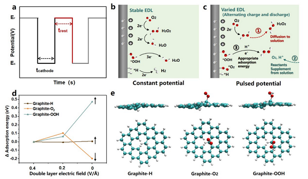 (a)脈沖電催化中的tcathode and trest;(b)、(c) 恒電位電催化和脈沖電位電催化之間的反應(yīng)路徑存在差異;(d) EDL電場(chǎng)強(qiáng)度變化對(duì)ORR中間體吸附能的影響;(e) 具有固有缺陷的石墨烯的中間體(*H/*O2/*OOH)吸附模型。