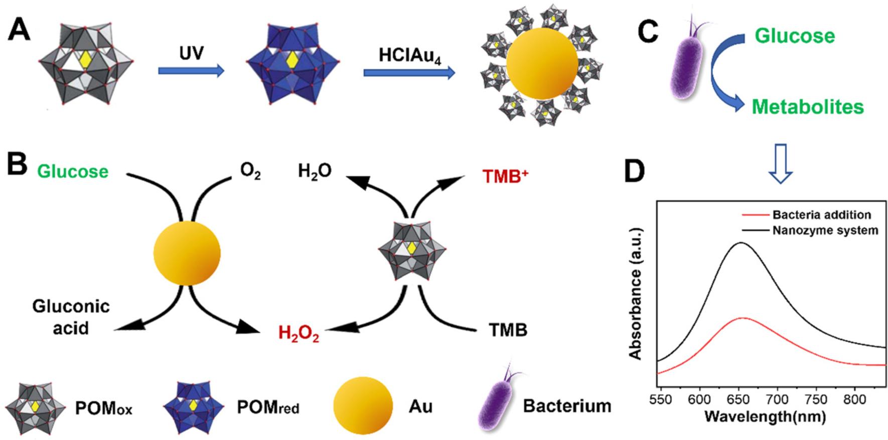 圖1納米酶級(jí)聯(lián)催化的細(xì)菌檢測(cè)原理示意圖。(A) 一步還原法制備Au@POM(B) 級(jí)聯(lián)催化Au@POM納米酶。(C) 細(xì)菌在代謝過程(D)細(xì)菌/無細(xì)菌生物體系中可見光吸收強(qiáng)度。