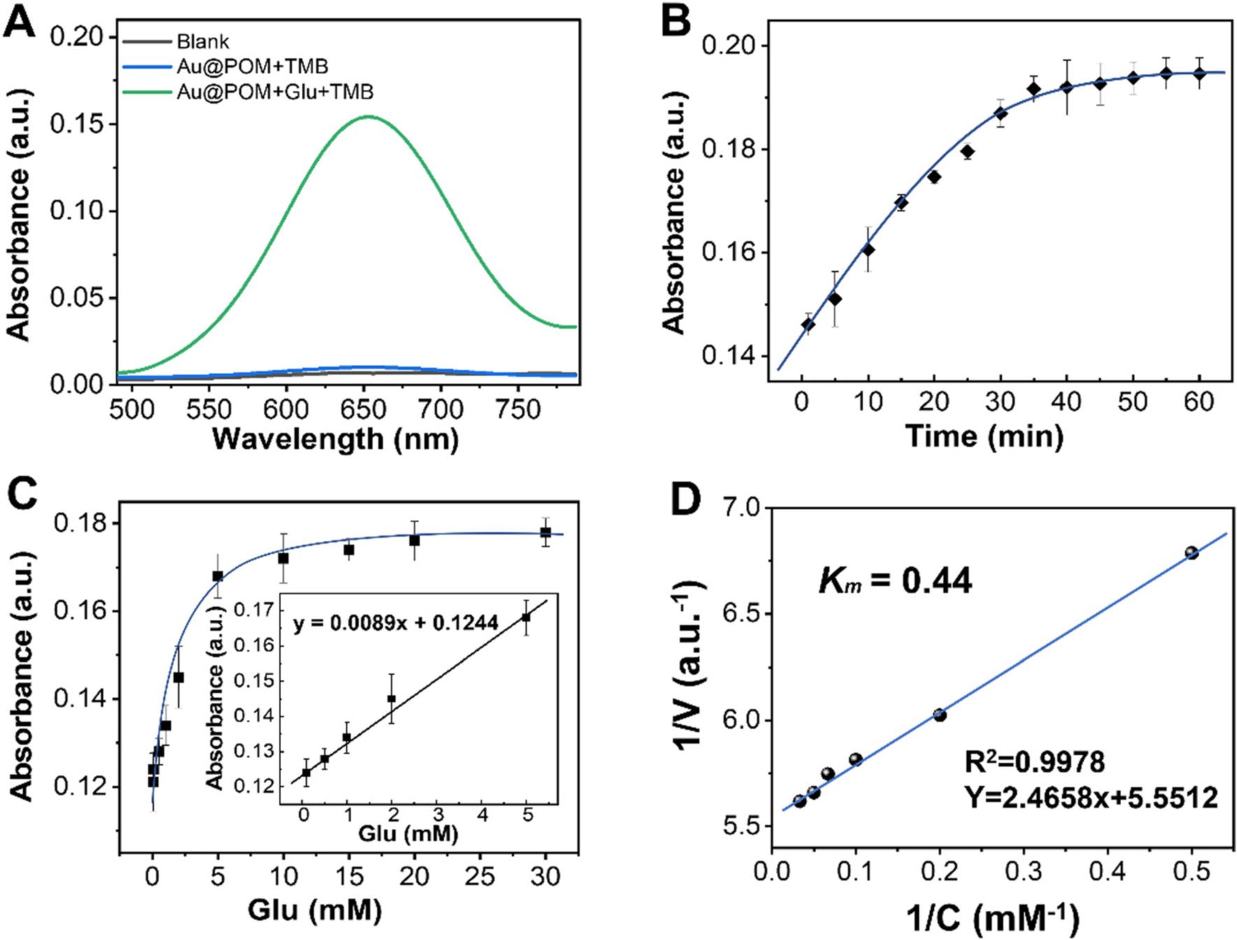 圖3 (A)不同體系可見光吸收光譜;(B)Au@POMs + Glu + TMB納米酶級(jí)聯(lián)催化體系可見光吸收譜峰與反應(yīng)時(shí)間關(guān)系;(C)對(duì)葡萄糖濃度做Michaelis–Menten模型的穩(wěn)態(tài)動(dòng)力學(xué)測(cè)定(TMB濃度為1.2mM);(D)納米酶級(jí)聯(lián)反應(yīng)的雙倒數(shù)圖