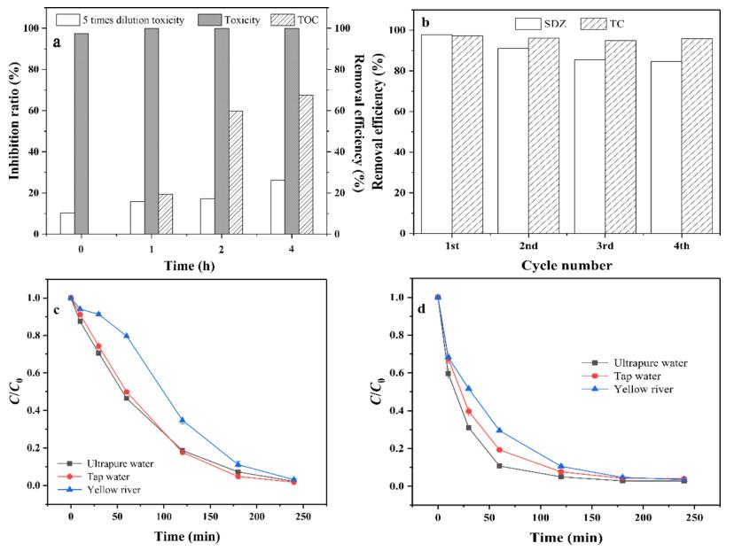 圖6 (a) SC/PS體系中TOC和毒性的變化;(b) SC活化PS催化降解SDZ和TC的可重復(fù)利用性;實(shí)際廢水中(c) SDZ和(d) TC的降解效率
