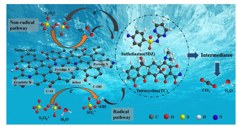 水中獸用抗生素磺胺嘧啶(SDZ)和四環(huán)素(TC)難以被生物降解,長(zhǎng)期接觸會(huì)增加胃、腸、肝、腎損傷風(fēng)險(xiǎn),給人類健康造成不可逆轉(zhuǎn)危害。傳統(tǒng)的抗生素去除技術(shù)包含生物法、電解法、光催化法等,但都因其高成本和復(fù)雜工藝而受到限制。高級(jí)氧化工藝通過生成高活性氧化物種降解有機(jī)污染物已成為目前的主流技術(shù),半焦(Semi-coke,SC)是煤化工過程中的固體廢棄物,來源廣泛、成本低廉,可作為礦物生物炭活化過硫酸鹽(PS)生成活性氧(ROS),用于抗生素的高效降解去除。