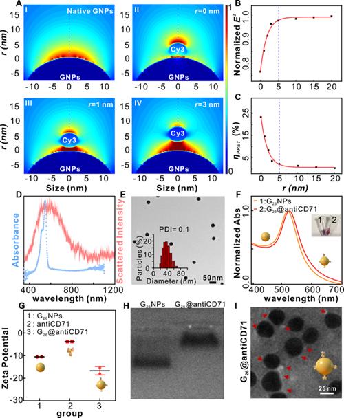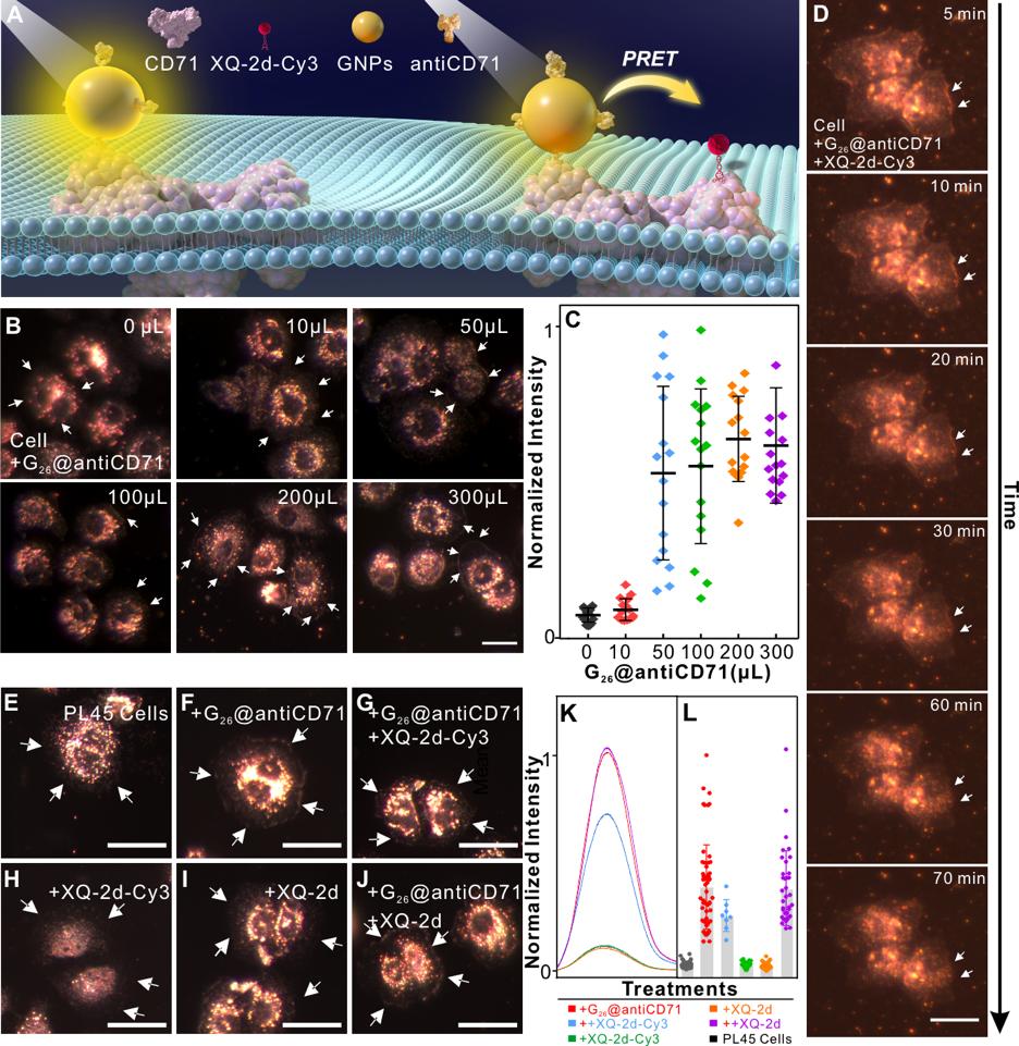 近日,課題組報道了單個納米金顆粒和單個分子偶極之間的PRET現象。研究團隊使用兩種無競爭性結合的配體,即適體XQ-2d-Cy3和抗體antiCD71,識別活細胞膜上同一受體蛋白CD71的不同位點;適體攜帶小分子熒光標簽作為能量受體,抗體攜帶單粒徑的金顆粒作為供體,觀察到了能量供體與受體之間無任何“系繩”連接的PRET現象?;诖嗽?,構筑了靈活的PRET光學納米尺,實現了活細胞表面分子距離和蛋白互作的觀察與測量。有限元理論模擬和暗場成像實驗結果一致表明,該PRET納米尺在活細胞膜表面測量位點分離距離和蛋白互作具有可行性和穩(wěn)定性,在分析科學納米尺度測量領域具有廣泛的應用前景。