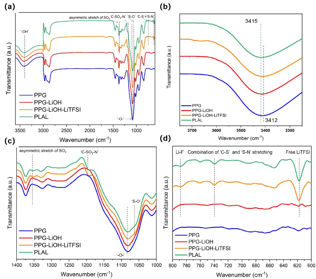 圖. “PPG”、“PPG-LiOH”、“PPG-LiOH-LiTFSI”和“PLAL ISC”紅外光譜比較。(a)在600-3600 cm-1范圍內(nèi);(b)在范圍為3250-3750 cm-1內(nèi)。在加入LiOH后,與“-OH”相關(guān)的峰出現(xiàn)了輕微的藍(lán)移,從3412 cm-1到3415 cm-1。加入LiTFSI后,“-OH”基團(tuán)的峰由于和“TFSI-”發(fā)生了耦合作用所以產(chǎn)生了紅移,移至3412 cm-1。加入Al2O3后,峰位置恢復(fù)到3415 cm-1;(c)在范圍為1000-1400 cm-1范圍內(nèi);(d)在600-800 cm-1范圍內(nèi)。