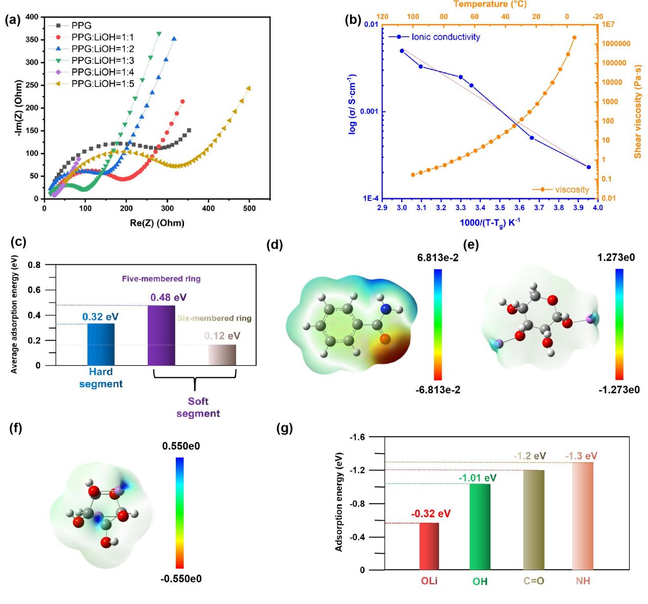 圖.基于PPG對(duì)不同LiOH添加量的PLAL ISC的電化學(xué)阻抗譜(EIS)測(cè)量和理論模擬。(a)不同LiOH(摩爾比為1:0 ~ 1:5,厚度為400 μm)下PLAL ISC的EIS;(b) PLAL離子電導(dǎo)率和粘度隨溫度的變化;(c) PU“硬段”和“軟段”各原子對(duì)LFP的平均吸收能;(d)?;被?,(e) PPG分子的五元環(huán)部分和(f) PPG分子的六元環(huán)部分的分子靜電勢(shì)模擬;(g)四個(gè)典型官能團(tuán)對(duì)Li+ (“-NH”、“-C=O”、“-OH”和“-OLi”)的吸附能。