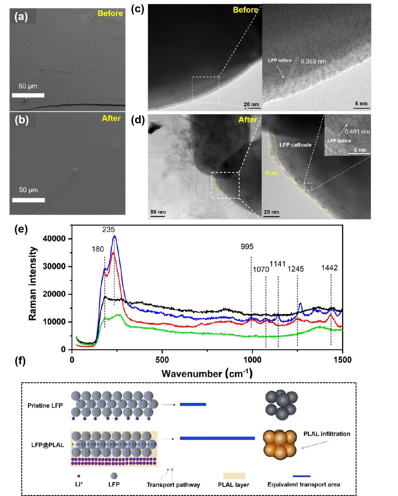 圖. 低溫電鏡和表面增強(qiáng)拉曼SERS分析。俯視圖LFP陰極上PLAL ISC的冷凍掃描電鏡圖像(a)循環(huán)前后;(b)電極材料在200次循環(huán)前(b)和200次循環(huán)后(d)的Cryo-TEM圖像(樣品經(jīng)冷凍切片處理);(e) LFP@PLAL ISC 200次循環(huán)前的SERS(黑色),200次循環(huán)后的SERS(藍(lán)色),原始LFP陰極(紅色)和膠體金增強(qiáng)基底(綠色)。200次循環(huán)后,在LFP@PLAL光譜中出現(xiàn)特征譜線,表明PLAL已經(jīng)滲透到LFP晶格中;(f)不使用PLAL ISC或使用PLAL ISC時(shí)電極中的離子傳輸示意圖。