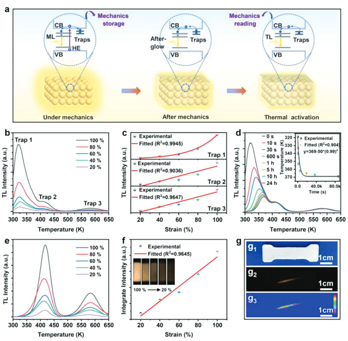 通過利用SAOCD/PDMS材料中特有的自充能物理過程,進(jìn)一步發(fā)展出了一種力學(xué)信息的存儲(chǔ)與可視化讀取技術(shù)(圖4)。在機(jī)械刺激下,力學(xué)信息將會(huì)以陷阱捕獲載流子的方式在材料內(nèi)部進(jìn)行存儲(chǔ),隨后,在熱刺激下,所存儲(chǔ)的力學(xué)信息將以可視化的形式得到讀取,所存儲(chǔ)和讀取的力學(xué)信息主要包括力學(xué)強(qiáng)度、發(fā)生時(shí)間及其空間分布等。