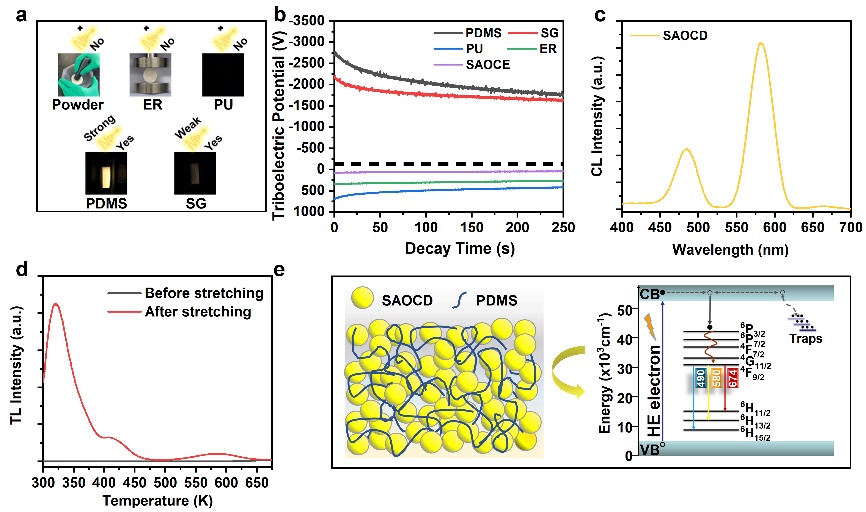 本工作通過將SAOCD (SAOCD) 粉末復(fù)合到PDMS基質(zhì)中,創(chuàng)建了一種新型的力致發(fā)光材料,即自充能、可持續(xù)力致發(fā)光材料。無需任何預(yù)輻照,所制備的SAOCD/PDMS彈性體可以直接在力學(xué)刺激下表現(xiàn)出強(qiáng)烈且持久的力致發(fā)光,這極大地促進(jìn)了其在力學(xué)照明、顯示、成像和可視化中的應(yīng)用。通過研究基體效應(yīng)以及熱釋光、陰極發(fā)光和摩擦電特性,界面摩擦起電誘導(dǎo)的電子轟擊過程被證明是機(jī)械刺激下SAOCD中自充能能量的原因。基于獨(dú)特的自充電過程,SAOCD/PDMS進(jìn)一步展現(xiàn)出力學(xué)存儲(chǔ)和可視化讀取行為,為機(jī)械工程、生物工程和人工智能領(lǐng)域處理力學(xué)相關(guān)問題帶來了新穎的思路和方法。