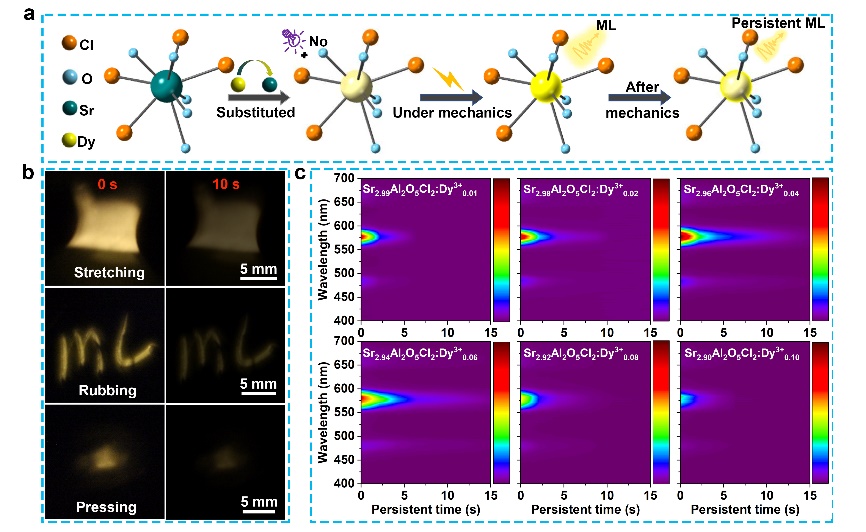 力致發(fā)光是指材料在力學(xué)刺激下產(chǎn)生的一種發(fā)光行為。由于其獨(dú)特的力學(xué)-光學(xué)響應(yīng)特性,力致發(fā)光為實(shí)現(xiàn)力學(xué)傳感及其可視化提供了新思路和新途徑。目前發(fā)現(xiàn)的力致發(fā)光材料多數(shù)僅表現(xiàn)出動(dòng)態(tài)力學(xué)刺激下的瞬態(tài)發(fā)射行為,極大地限制了其在力學(xué)的可視化顯示和成像方面的應(yīng)用??沙掷m(xù)力致發(fā)光材料能夠在力學(xué)刺激停止后繼續(xù)保持發(fā)光行為,對(duì)可持續(xù)力致發(fā)光材料的開發(fā)是應(yīng)對(duì)上述問題的有效方式。此前,研究人員通過陷阱工程設(shè)計(jì),在特定材料體系中獲得了力學(xué)刺激后可持續(xù)的力致發(fā)光現(xiàn)象。然而,該類可持續(xù)力致發(fā)光材料在使用前必須經(jīng)歷預(yù)輻照,在其結(jié)構(gòu)內(nèi)部預(yù)先儲(chǔ)存能量,這不僅增加了實(shí)際應(yīng)用時(shí)操作的難度,也難以實(shí)現(xiàn)該類材料的循環(huán)穩(wěn)定使用。因此,實(shí)現(xiàn)無需預(yù)輻照的自充能、可持續(xù)力致發(fā)光成為當(dāng)前研究的熱點(diǎn)之一。
