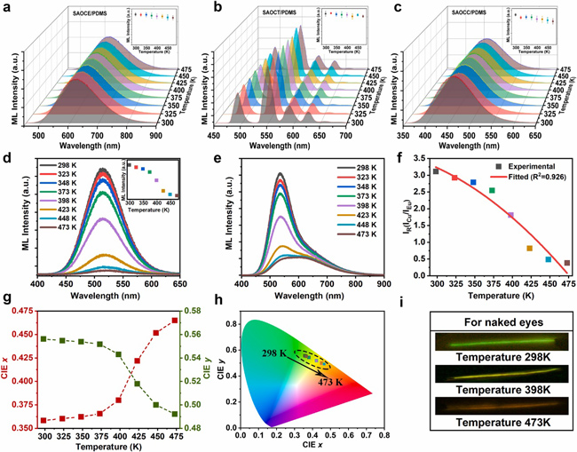 圖4 (a-c)SAOCL/PDMS復(fù)合彈性體在不同溫度下的力致發(fā)光光譜;(d)ZnS:Cu/PDMS復(fù)合彈性體在不同溫度下的力致發(fā)光光譜; (e)SAOCE/ZnS:Cu/PDMS在不同溫度下的ML光譜;(f)溫度誘導(dǎo)SAOCE/ZnS:Cu/PDMS的ICu/IEu變化;(g) 顏色坐標(x, y)與環(huán)境溫度之間的相關(guān)性; (h) 溫度誘導(dǎo)的SAOCE/ ZnS:Cu/PDMS的ML色演變;(i) 用肉眼直接觀察ML顏色進行可視化的溫度感應(yīng)。