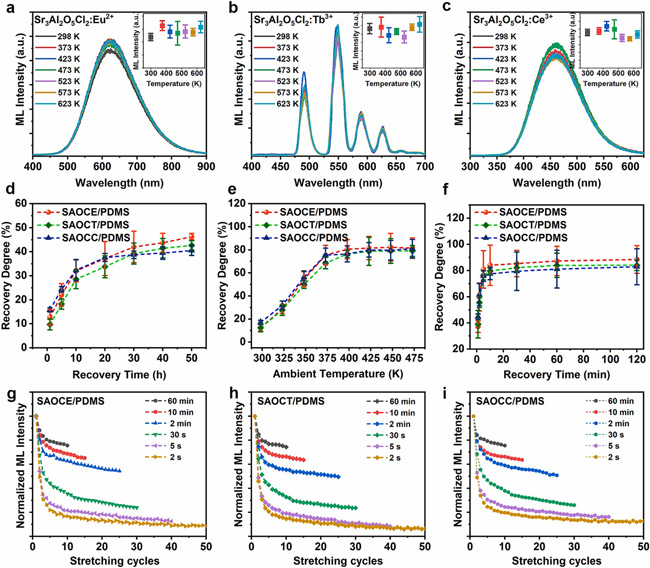 圖2 (a-c)不同溫度下預(yù)熱處理的ML強度;(d)SAOCL/PDMS復(fù)合彈性體在室溫下的自恢復(fù)特性(e)SAOCL/PDMS復(fù)合彈性體在不同環(huán)境溫度下放置5 min和(f)在398 K下放置不同時間的自恢復(fù)程度;(g-i)SAOCL/PDMS復(fù)合彈性體在 398 K不同時間間隔拉伸ML發(fā)光的循環(huán)穩(wěn)定性。