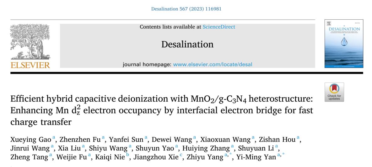 北京化工大學(xué)的嚴(yán)乙銘教授、楊志宇研究員課題組在Desalination期刊發(fā)表了題為“Efficient hybrid capacitive deionization with MnO2/g-C3N4heterostructure: Enhancing Mn dz2 electron occupancy by interfacial electron bridge for fast charge transfer”的論文。本文通過在MnO2/g-C3N4異質(zhì)結(jié)構(gòu)中構(gòu)建界面電子橋,增強(qiáng)的Npz-Mndz2軌道雜化成功提高了其用于HCDI的性能。Npz-Mndz2軌道雜化誘導(dǎo)了從g-C3N4到MnO2的電子遷移,實(shí)現(xiàn)了高的Mn dz2電子占據(jù)。在工作電壓為1.2V的條件下,MnO2/g-C3N4表現(xiàn)出68mg g-1的除鹽量,3.6mg g-1 min-1的除鹽率以及0.7224kWh kg-1的能耗。這項(xiàng)創(chuàng)新的工作為激活金屬氧化物電化學(xué)活性,從而為加速電荷轉(zhuǎn)移提供了一個(gè)可行的方法。?