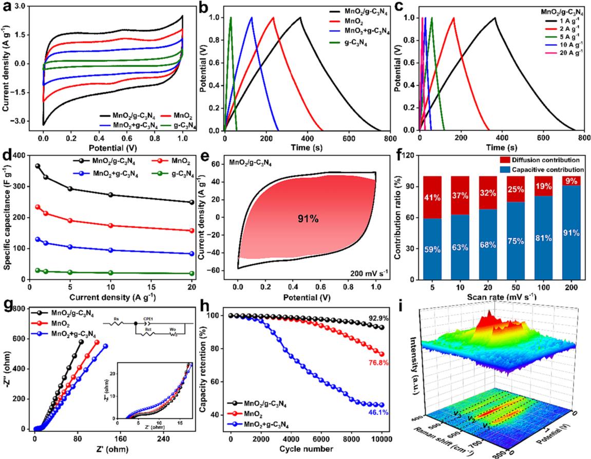 電化學(xué)測試結(jié)果如圖3所示。a)循環(huán)伏安(CV)曲線顯示,四種樣品均呈準(zhǔn)矩形形狀,其中MnO2和MnO2/g-C3N4明顯呈現(xiàn)出清晰的氧化還原峰。圖3b,c的恒流充放電(GCD)曲線可以看出,四個(gè)樣品的GCD曲線都呈現(xiàn)出近似對稱的三角形?;贕CD曲線,計(jì)算了不同電流密度下的比電容,所得結(jié)果如圖3d所示。電容控制百分比情況如圖3f所示,電容控制的MnO2/g-C3N4的大百分比表明了MnO2/g-C3N4促進(jìn)離子轉(zhuǎn)移的特征。圖3g等效電路對電化學(xué)阻抗譜(EIS)數(shù)據(jù)表明不同材料之間的Rs存在差異,這可能是由于電極材料與集流器之間不可避免的系統(tǒng)接觸不良造成的。循環(huán)性能如圖3h。