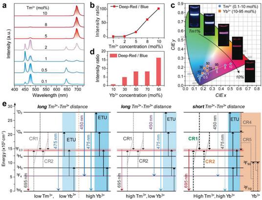 圖3. 穩(wěn)態(tài)激發(fā)的光色調(diào)控:a,b) Tm3+濃度摻雜樣品980 nm穩(wěn)態(tài)激發(fā)的發(fā)射光譜及紅-藍(lán)比變化規(guī)律;c)不同摻雜濃度樣品發(fā)光對(duì)應(yīng)的CIE坐標(biāo)值和發(fā)光照片;d) Yb3+濃度摻雜樣品的紅-藍(lán)比;e)不同摻雜濃度時(shí)的發(fā)光和交叉弛豫示意圖。