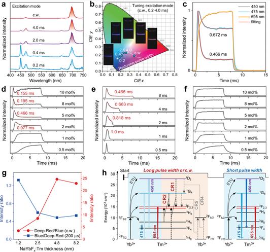 圖4. 非穩(wěn)態(tài)激發(fā)的光色調(diào)控:a,b)不同脈寬980 nm激光激發(fā)的發(fā)射光譜、對(duì)應(yīng)的CIE坐標(biāo)以及發(fā)光照片;c-f)發(fā)射峰的暫態(tài)曲線;g)發(fā)光層厚度變化樣品在穩(wěn)態(tài)激發(fā)時(shí)的紅-藍(lán)比和在非穩(wěn)態(tài)激發(fā)時(shí)的藍(lán)-紅比;h)脈沖調(diào)控的可能動(dòng)力學(xué)過程