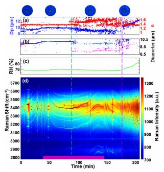 圖3. (a) 檢索到的直徑(Dp)和折射率(n)。(b) 測量室內(nèi)前后的相對濕度(RH)。(c) 捕獲的水性NaCl滴液的拉曼光譜時間序列