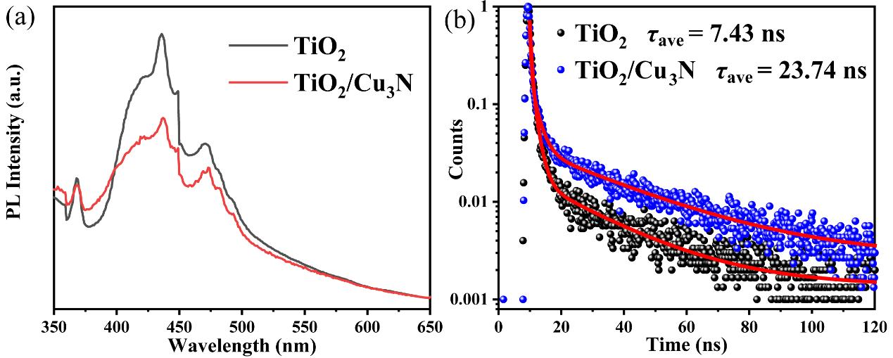 程正旺等采用磁控濺射法,將p型Cu3N薄膜沉積到一維 n型TiO2納米陣列上,形成了TiO2/Cu3N p-n異質(zhì)結(jié)。得益于合適的能隙和內(nèi)建電場(chǎng)的協(xié)同作用,形成的TiO2/Cu3N p-n異質(zhì)結(jié)不僅將帶隙從TiO2的3.09 eV減小到TiO2/Cu3N的2.01 eV,光響應(yīng)范圍也從從紫外區(qū)擴(kuò)展到可見光區(qū)域。此外,光生電子-空穴對(duì)的分離和轉(zhuǎn)移效率明顯改善,平均載流子壽命延長(zhǎng)了3倍。進(jìn)一步地,在> 420 nm可見光照射和-0.97 V vs. RHE(可逆氫電極)條件下,光電流密度從TiO2的-0.33 mA/cm2提高到TiO2/Cu3N的-4.66 mA/cm2,提高了約14.12倍。此外,構(gòu)建的TiO2/Cu3N異質(zhì)結(jié)表現(xiàn)出穩(wěn)定的PEC析氫性能,相應(yīng)的可見光分解水產(chǎn)氫速率達(dá)到6.98 µmol/cm²/h。以上結(jié)果表明:構(gòu)建具有合適帶隙和功函數(shù)的p-n異質(zhì)結(jié)是提高TiO2光電催化性能的一種有效途徑,并且有望應(yīng)用于其他光電催化劑。本項(xiàng)研究為設(shè)計(jì)和制備高效、低成本、無毒的PEC分解水電極和其他光電子化學(xué)應(yīng)用提供了一條有效的途徑。