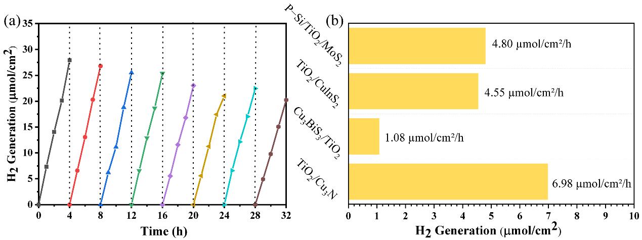 圖7. (a) TiO2/Cu3N在> 420 nm可見光照射下PEC產(chǎn)氫H2的循環(huán)穩(wěn)定性。(b)本研究中TiO2/Cu3N的平均產(chǎn)氫速率與報(bào)道的TiO2基異質(zhì)結(jié)結(jié)果的比較。