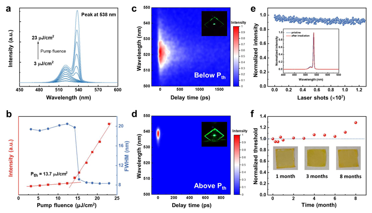 (a) 激發(fā)能量密度相關(guān)的PL光譜;(b) 發(fā)光峰強(qiáng)度、半峰寬與激發(fā)能量密度關(guān)系圖;(c) 和(d)分別為在激發(fā)能量密度大于和小于ASE閾值時(shí)條紋相機(jī)成像圖;(e) 2倍閾值能量密度輻照下ASE強(qiáng)度的變化;(f)空氣中ASE閾值的長期穩(wěn)定性實(shí)驗(yàn)