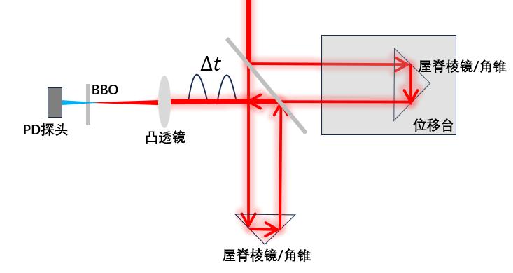 在超快科學領(lǐng)域,延遲線常用于自相關(guān)測脈寬,以及泵浦探測,時域光譜等領(lǐng)域。由于飛秒量級的時間已經(jīng)遠超出了示波器、PD探頭的響應速度極限,因此無法直接通過示波器等儀器直接測出脈寬,一般通過自相關(guān)的方式進行測量,自相關(guān)測量的原理是將一個脈沖分成等強度的兩個脈沖,使其中一束光通過延遲線后將兩束光合束并通過倍頻晶體(如BBO),通過PD探頭測量,PD探頭的測量結(jié)果正比于光強