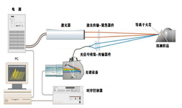圖2展示了激光等離子體光譜工作的三個(gè)階段。它始于脈沖激光與物質(zhì)的相互作用過(guò)程——當(dāng)聚焦到目標(biāo)物表面或者透明物質(zhì)內(nèi)部的激光強(qiáng)度超過(guò)閾值時(shí),將發(fā)生光學(xué)擊穿現(xiàn)象,此時(shí)可以觀察到激光等離子體形成的火花。激光等離子體的產(chǎn)生主要是一個(gè)非線(xiàn)性吸收過(guò)程(多光子效應(yīng)),而非共振吸收過(guò)程,對(duì)激光波長(zhǎng)的依賴(lài)并不明顯,這不但為激光參數(shù)的選擇提供了較大的空間,也使LIPS技術(shù)的應(yīng)用具有無(wú)需采樣-預(yù)處理過(guò)程、檢測(cè)周期短、適應(yīng)性強(qiáng)的特點(diǎn),可以用于固、液、氣及浮質(zhì)目標(biāo)物的成份原位探測(cè)。同時(shí)激光具有良好的指向性,激光輻照面積和深度可以控制在微米量級(jí),這使LIPS技術(shù)具有較好的空間分辨能力——利用LIPS裝置對(duì)樣品進(jìn)行空間掃描,可以實(shí)現(xiàn)微米分辨的元素成份分布。