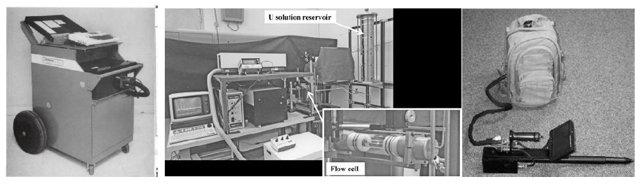上世紀(jì)80年代開(kāi)始,美國(guó)洛斯阿拉莫斯實(shí)驗(yàn)室(LANL)就嘗試?yán)眉す獾入x子體光譜開(kāi)展工作場(chǎng)所氣溶膠有害成份和硝酸鈾等涉核物質(zhì)的原位探測(cè)(圖4)。他們建立的實(shí)驗(yàn)室裝置對(duì)氣溶膠中鈹元素的直接探測(cè)的靈敏度接近0.6 ppb,相當(dāng)于每立方米空氣中的鈹含量接近0.8μg。實(shí)驗(yàn)裝置對(duì)鈾溶液的探測(cè)限也達(dá)到了100mg/L,相當(dāng)于100 ppm。同一時(shí)期,他們還嘗試開(kāi)展了工業(yè)(熔鹽)及環(huán)境介質(zhì)(土壤)中痕量涉核元素的探測(cè)。這些工作充分展示了LIPS技術(shù)在現(xiàn)場(chǎng)適應(yīng)性、靈敏度、探測(cè)效率等方面的潛力,并為現(xiàn)場(chǎng)應(yīng)用裝備的開(kāi)發(fā)奠定了基礎(chǔ)。