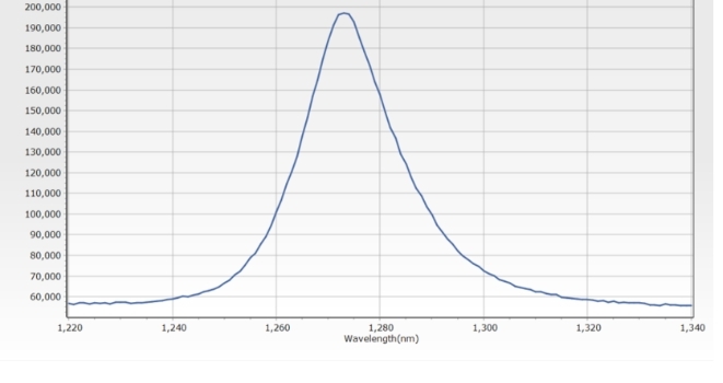 穩(wěn)態(tài)光譜測(cè)試使用532nm激光器,能量為80mW。發(fā)射側(cè)光柵刻線密度為600g/mm,閃耀波長(zhǎng)為750nm。掃描范圍設(shè)置為1220-1340nm,步長(zhǎng)1nm,帶寬3nm,積分時(shí)間200ms,重復(fù)5次。發(fā)射側(cè)使用800nm高通濾光片消除倍頻峰信號(hào)干擾。近紅外R5509-73 PMT在1274 nm處測(cè)到單線態(tài)氧的發(fā)光峰,如圖3所示。
