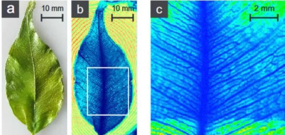 上圖為利用太赫茲進(jìn)行成像的一個(gè)例子,其中a為樹葉的可見光下的圖片,b為太赫茲成像效果,c為太赫茲成像的放大圖像。由于太赫茲比可見光穿透能力強(qiáng),因此,可以較為清楚地顯示物體內(nèi)部的情況。