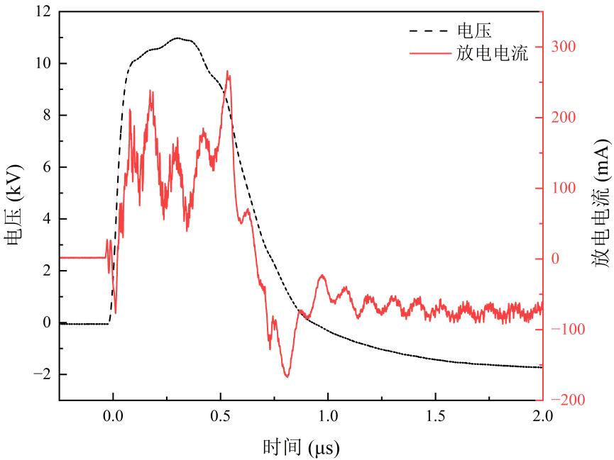 同時(shí),實(shí)驗(yàn)過(guò)程中采集了Ar等離子體射流放電電壓電流波形,如圖4所示。其中,放電電流為總電流減去位移電流。從圖中可以發(fā)現(xiàn)Ar等離子體射流在一個(gè)脈沖周期內(nèi)存在兩次放電,分別發(fā)生在上升沿和下降沿,且上升沿的放電持續(xù)時(shí)間較長(zhǎng)。