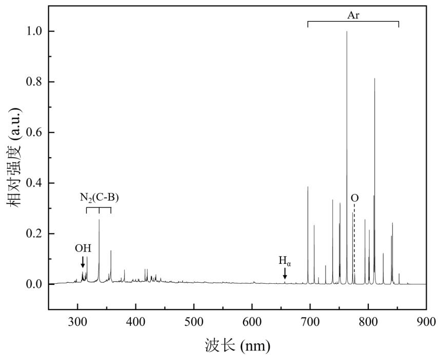 圖5展示了Ar等離子體射流在250nm-900nm范圍內(nèi)的發(fā)射光譜。測(cè)量過(guò)程中利用凸透鏡將等離子體的發(fā)射光匯聚進(jìn)入光譜儀入射狹縫,狹縫寬度50μm,光柵刻度1200g/cm。從發(fā)射光譜中可以明顯觀察到N2、OH、O原子、Ar等粒子的發(fā)射譜線。