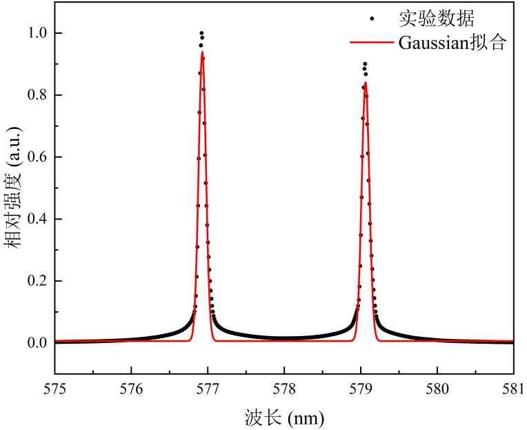 儀器展寬(ΔλI)測(cè)量擬合光譜如圖6所示。在實(shí)驗(yàn)條件下測(cè)定低壓汞燈在577nm與579nm處的特征譜線,經(jīng)過(guò)Gaussian擬合,得到儀器展寬ΔλI=0.1150nm。