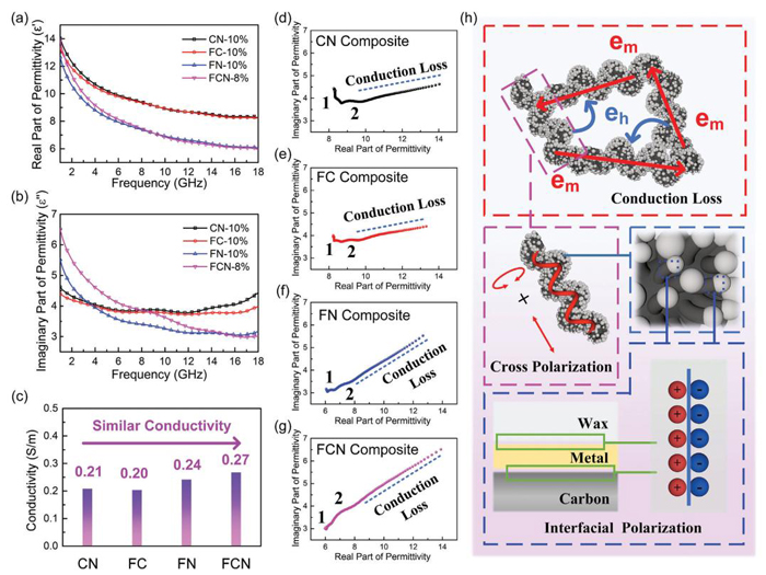 圖六:a)介電常數(shù)實(shí)部,b)介電常數(shù)虛部,c) CN、FC、FN和FCN復(fù)合材料的電導(dǎo)率;d) CN, e) FC, f) FN, g) FCN復(fù)合材料的Cole-Cole圖;H)樣品介電損耗機(jī)理示意圖。