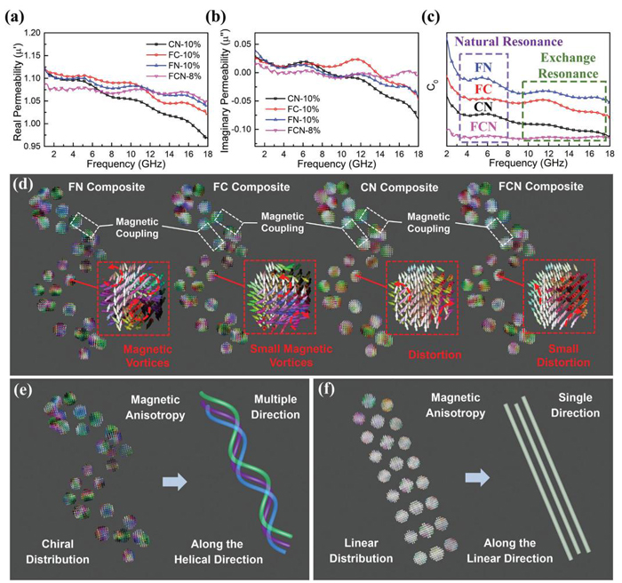 圖七:a)磁導(dǎo)率實(shí)部,b)磁導(dǎo)率虛部,c) CN、FC、FN、FCN復(fù)合材料的渦流感應(yīng)系數(shù),d) CN、FC、FN和FCN復(fù)合材料的微磁模擬,e)手性分布模式和f)線性分布模式的微磁仿真。