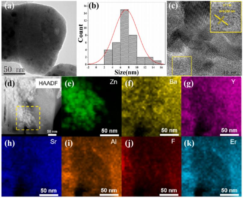隨后,通過X射線衍射測試,證實(shí)了具有單相的ZnF2納米晶體在玻璃樣品中析出,晶粒大小在8μm左右。透射電鏡的測試結(jié)果表明ZnF2晶體在玻璃樣品中均勻析出,并且Er3+在晶體區(qū)域出現(xiàn)了明顯的富集現(xiàn)象。稀土元素富集在具有較低聲子能量的晶體附近會(huì)降低非輻射馳豫速率從而起到增強(qiáng)熒光發(fā)射的效果。