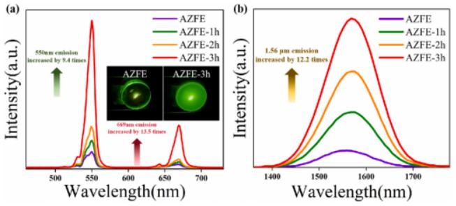 *后,基于Er3+摻雜的氟化物玻璃陶瓷樣品,對其進(jìn)行了從可見至中紅外的熒光發(fā)射測試。測試發(fā)現(xiàn)氟化物玻璃陶瓷樣品在激發(fā)光的激發(fā)下展現(xiàn)出更強(qiáng)的可見光發(fā)射。通過一系列的全光譜發(fā)光測試,得到氟化物玻璃陶瓷樣品在可見和近紅外波段的發(fā)光增加了近10倍以上,在中紅外2.7μm和3.5μm波段也有較為明顯的增強(qiáng)效果。
