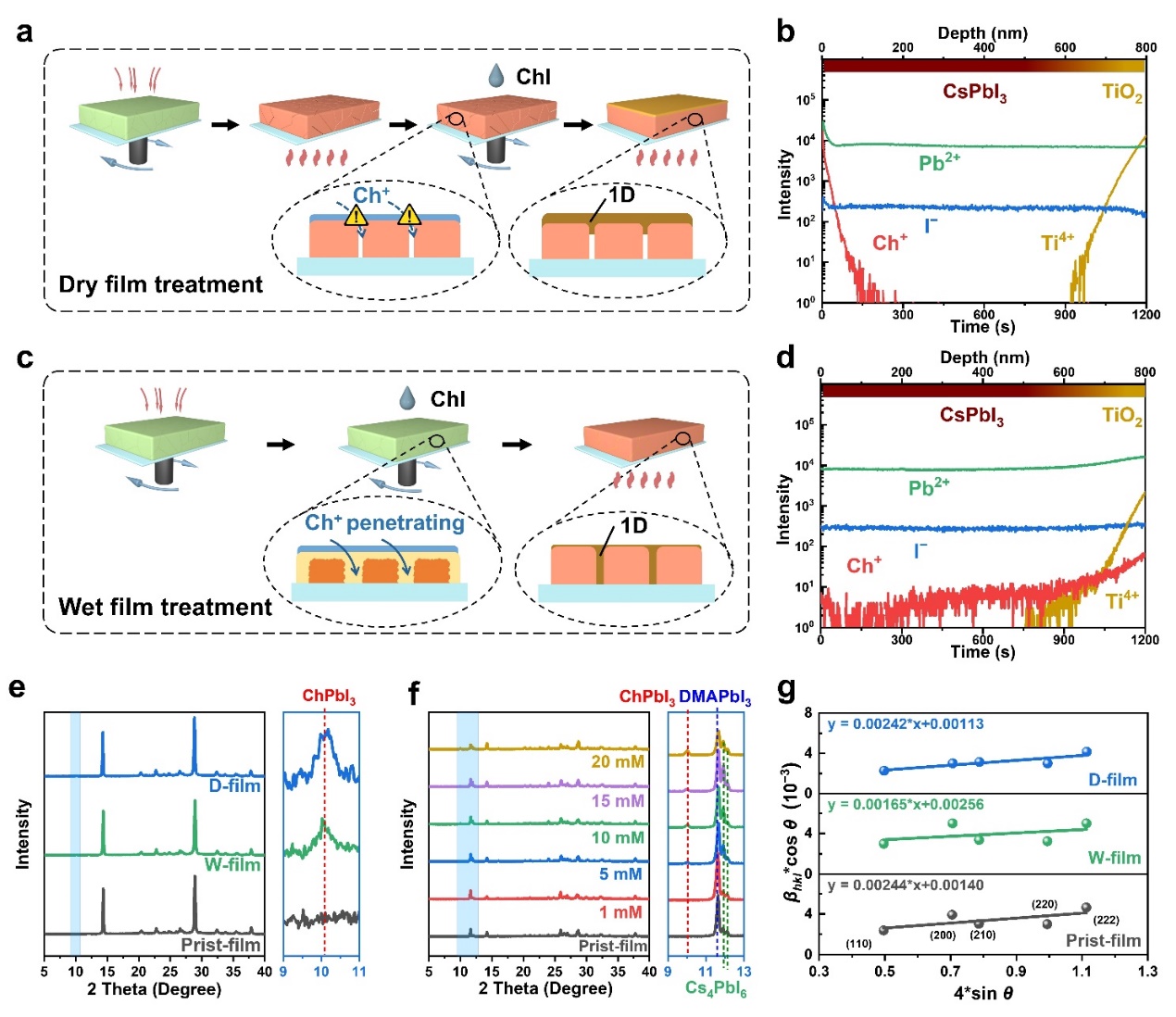 碘化膽堿(ChI)處理被證明可以有效鈍化CsPbI3薄膜的表面缺陷,在退火后處理(干膜處理)過程中,ChI與CsPbI3通過離子交換反應(yīng)形成1D ChPbI3,從而構(gòu)建1D/3D異質(zhì)結(jié)構(gòu)。然而,由于Ch+的滲透性有限,Ch+很難穿透整個鈣鈦礦薄膜并在體相中形成LD鈣鈦礦。因此,傳統(tǒng)的干膜處理不足以鈍化CsPbI3薄膜中的體相缺陷。鑒于此,作者利用ChI對薄膜的中間相組成的濕膜進(jìn)行處理,使ChI能夠擴散到薄膜深處。由于ChI沿著中間相晶體的晶界滲透濕膜,生成的1D ChPbI3傾向于覆蓋CsPbI3晶體。