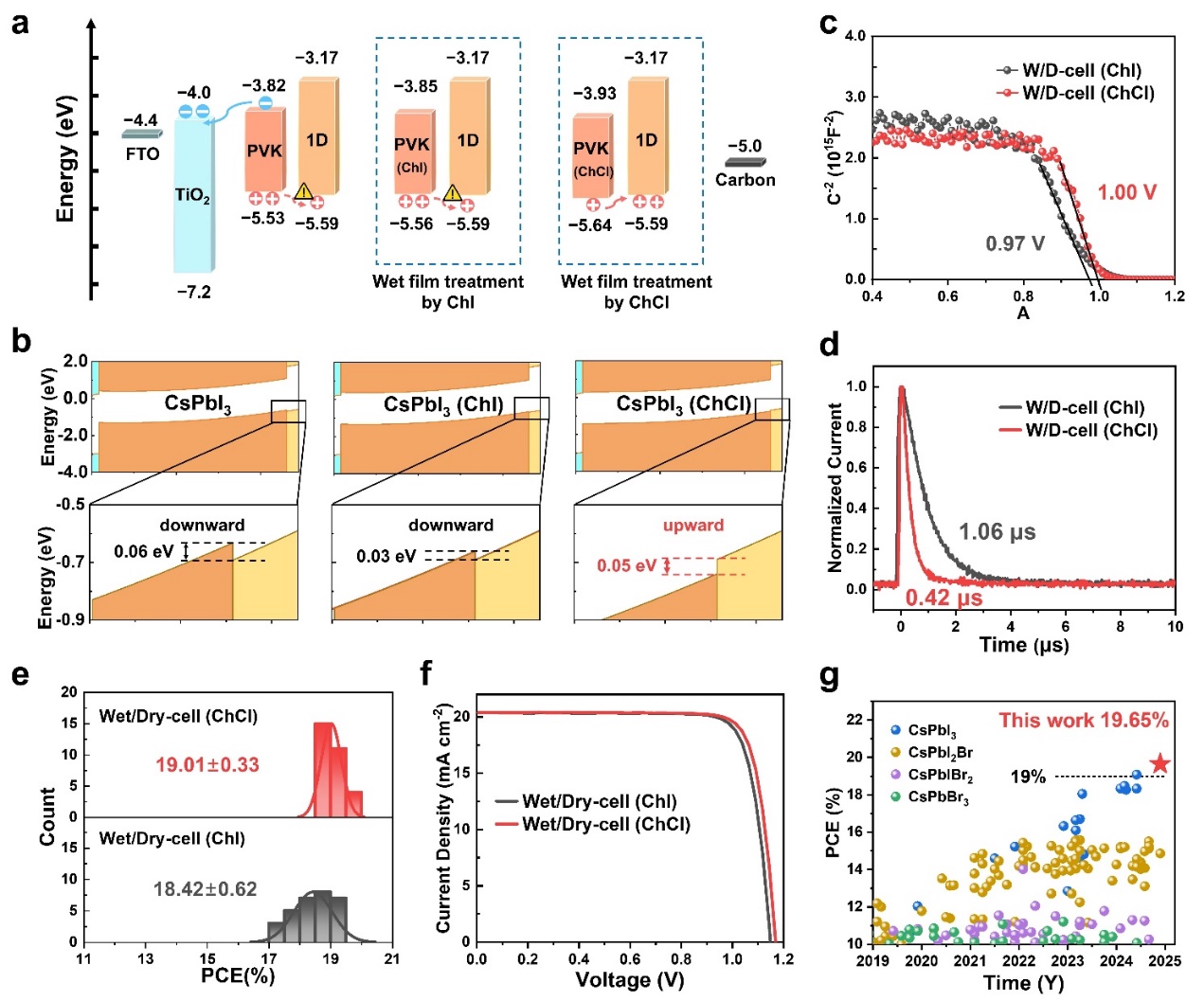 進(jìn)一步的,作者發(fā)現(xiàn),在濕膜處理過程中用ChCl代替ChI,能夠?qū)⑩}鈦礦/碳界面從向下變?yōu)橄蛏系哪軒澢?,?yōu)化了能級結(jié)構(gòu),消除了空穴提取勢壘,提高了載流子提取效率。*終獲得的CsPbI3 C-PSC的效率達(dá)到 19.65%,創(chuàng)下了無機 C-PSC 的新紀(jì)錄。