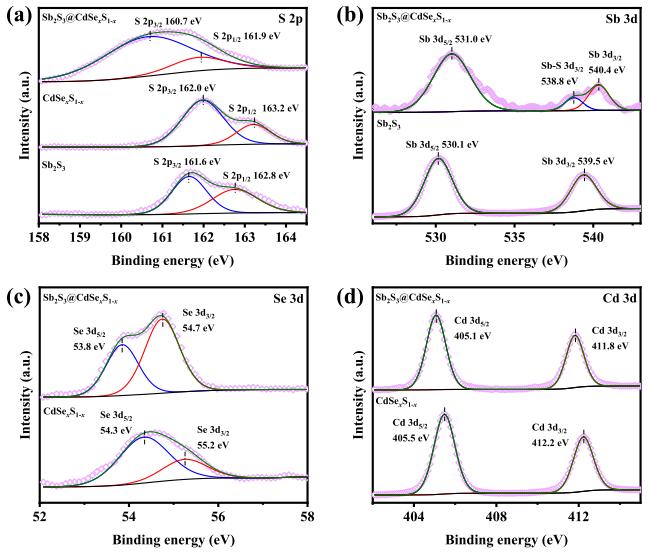 圖2 (a) S 2p,(b) Sb 3d,(c) Se 3d和(d) Cd 3d的高分辨率XPS光譜,分別對(duì)應(yīng)于Sb2S3、CdSexS1-x和Sb2S3@CdSexS1-x光電極。